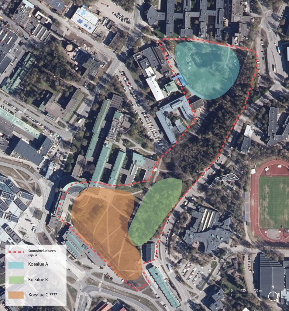 Työohjelmien esitysten jälkeen, meille esiteltiin vielä kootusti Otaniemen haasteita ja mahdollisuuksia. Alvarinaukiota suunnittelualueena ehdotettiin minulle jo aikaisemmissa ohjauksissa ja saamassani suullisessa ja kirjallisessa palautteessa. En tiedä miksi, mutta olen jollakin tavalla pelännyt siihen tarttumista, sillä se on niin näkyvä ja keskeinen osa kampusaluetta. Lisäksi ajattelin melko kapeakatseisesti pelkkää avointa nurmea ja unohdin huomioida aukiota reunustavan metsäalueen merkityksellisyyden tai nurmialueella vallitsevat ongelmalliset pintavedet, vaikka olen itsekin opiskelujeni aikana laittanut ne merkille.