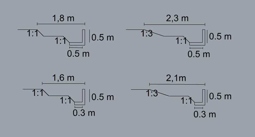 pohjan leveys 0.3-0.5 m, suurin mahdollinen luiskakaltevuus 1:1 ilman vahvikkeita. eli jos tulvatasanteella varustettu puoliksi rakennettu uoma voi toinen puoli olla suoralla ”seinällä” rakennettu ja toinen puoli voi tarpeen mukaan olla jopa 1:1. pituuskaltevuus 1-3%. Uoma sijoittuisi 50 metrin matkalle, jolloin maaston korkeuseroa 0.5-1.5 m. Koska maastoa laskettu jo aikaisemmin niin 1% lienee paras vaihtoehto.