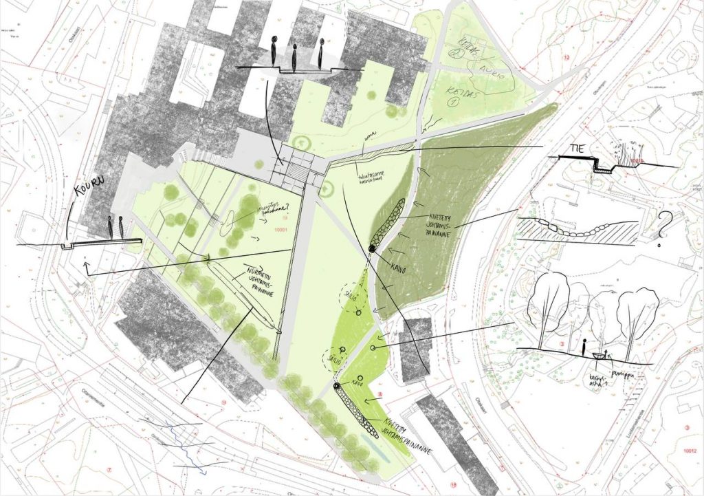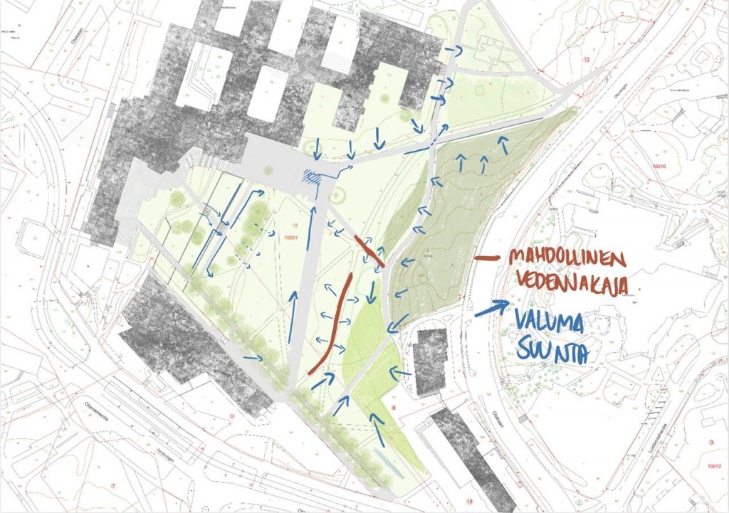 Pientä pohdintaa siitä, minne haluaisin veden valuvan. Ei kuitenkaan mitenkään lopullista. Aukio edellyttää varmaan jonkin sortin veden jakamista, mikäli halutaan kerätä vesiä kahteen eri paikkaan (päävesireitti ja kukkivan puutarhan mahdolliset säiliöt).