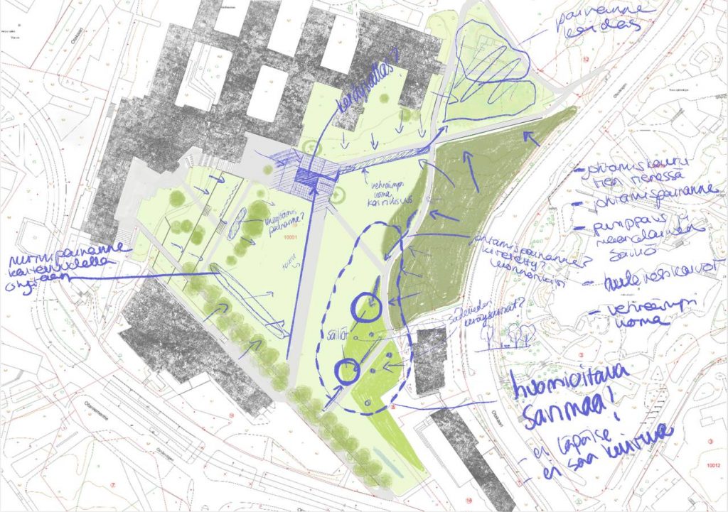 Kukkivan puutarhan (ja muutenkin aukion itäreunan) kannalta ajatukset ja ideat vielä avoimet. Pitää antaa ajatusten hautua, josko mieleen juolahtaisi jotakin otollista sinne. Lisäksi haasteina savimaa, ja miten käytännössä ohjataan vesi maanalaiseen säiliöön, josta mahdollista pumpata vesi takaisin maan pinnalle esim. kastelu. Toisaalta alkaa tulla semmoinen tunne, että vesi loppuu pian kesken. Välikritiikissä tuli huomio siitä voisiko osa vedestä olla muuta kuin kerättyä hulevettä, mutta mistä se otetaan tms. herää ajatus. Y-oven edessä oleva härpäkehökötyksen tarkoitus kuvata rakennettua painannetta, johon tarpeen mukaan vettä voisi kerääntyä. Kuivana aikana (lue, melkein aina) sen läpi voisi kävellä ihan normaalisti. ns. porrastettu pikku aukion jatke.