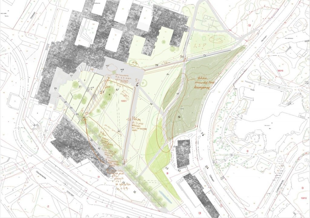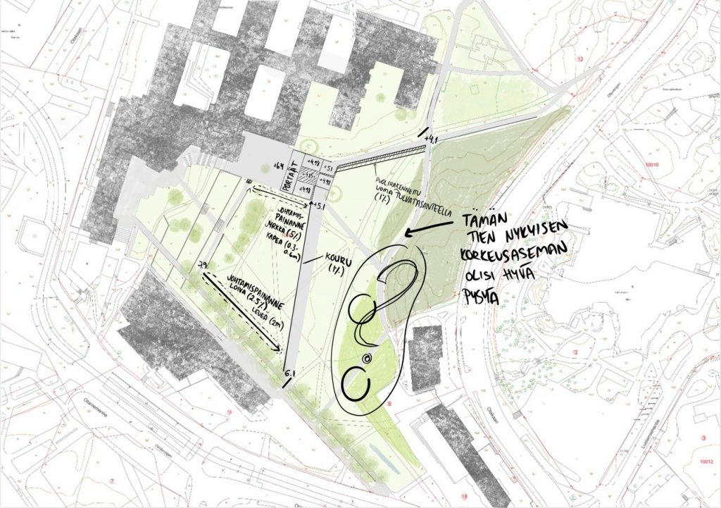 Toisaalta olisiko mahdollisuus tehdä kaksi samantyylistä perus nurmettua johtamispainannetta eri mitoilla. Toinen jyrkempi ja kapeampi ja toinen loivempi ja leveämpi. (sijoittelu aukiolle seuraavassa pohjakuvassa näkyvillä paremmin)