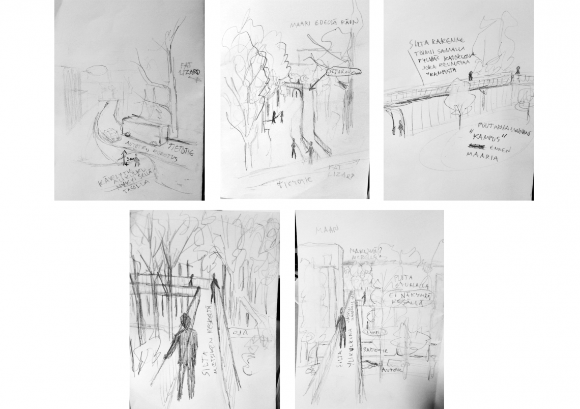 Kenttäkäynnillä piirtämiäni skissihahmotelmia reitistä, Tietotieltä Maaria kohti. Ajatuksena olisi nostaa tietotien autotie ja näin mahdollistaa kevyen liikenteen alikulku. Metsän välissä puikkelehtiva siltarakenne jää aika varmasti toteuttamatta, ”kampusta” kiertävää rakenteen haluaisin pyrkiä jotenkin toteuttamaan ja yhdistämään sen tiealueen ylittävään ja maarille laskeutuvaan siltarakenteeseen.