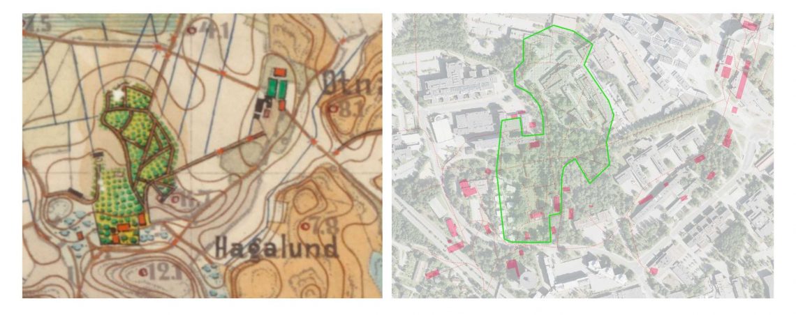 Vasemmalla 1872 kartta ja siihen vartavasten merkitty kartanopuiston alue. Oikealla kuva jossa puiston alue on rajattu 2024 ilmakuvan päälle. Suuri osa puistosta on hävinnyt. Onko todella ollut niin haastavaa kehittää kampusaluetta siten että niin historiallisia- kuin varmasti luontoarvojakin omaava puisto oltaisiin voitu säästää ehjänä ja yhtenäisenä. Häpeällistä tämäkin. Liekkö sitten Aallon vai jonkun muun tekosia. Puistoa pahiten turmelevat rakennukset eli Tietotie 4 sekä lukiorakennus ovat kuitenkin peräisin 70 luvulta.