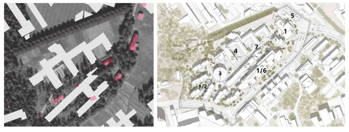 Vasemmalla ilmakuva vuodelta 1932 nykyaikaisten rakennusten kanssa kohdan hahmottamiseksi. Oikealla kemistin asemakaavan havainnekuva. Kuten näkyy ainakin satavuotias lehtokujanne ja kartanoaikainen metsikkö ollaan vetämässa täysin sileäksi rakentamisen tieltä kemianlaitoksen koillisessa päädyssä. Häpeällistä!